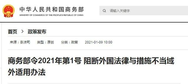 近日,中国商务部颁行的2021年第1号令《阻断外国法律与措施不当域外适用办法》引发热议。舆论认为,这意味着今后对于外国基于其国内法而实施的违反国际法、损害中国主权的“长臂管辖”措施,商务部有权要求不得承认和执行。此举也被视为对近两年美国利用长臂管辖打压中国企业的明确反制。