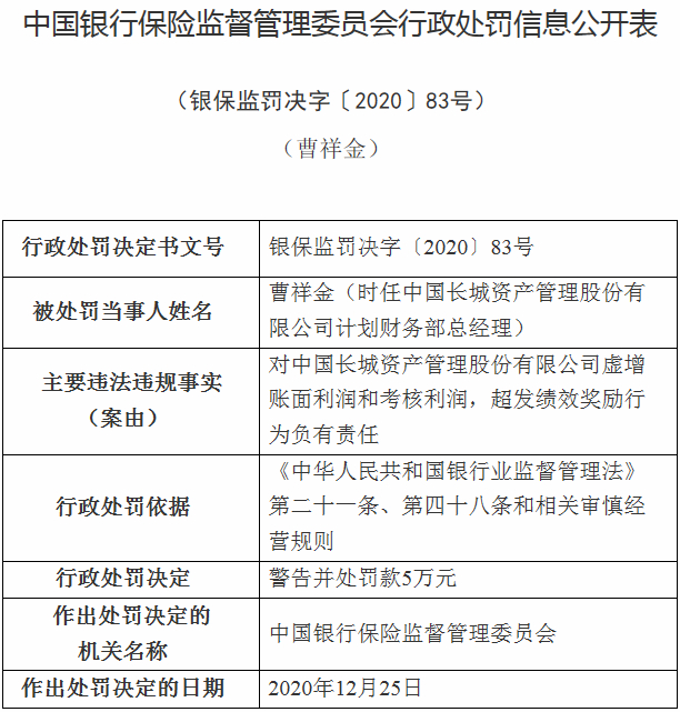 时任中国长城资产管理股份有限公司总裁助理、投资投行事业部总经理桑自国、时任公司计划财务部总经理曹祥金、时任公司投资投行事业部高级经理孙垂江对公司上述虚增账面利润和考核利润,超发绩效奖励行为负有责任。