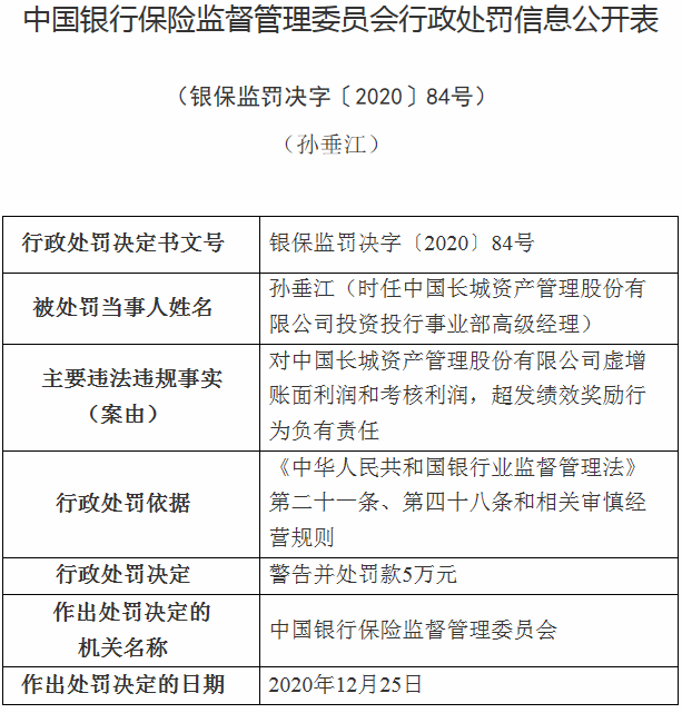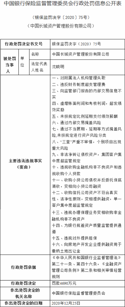 中国银行保险监督管理委员会依据《中华人民共和国银行业监督管理法》第二十一条、第四十六条,《金融资产管理公司条例》第二条和相关审慎经营规则,对中国长城资产管理股份有限公司罚款4690万元;根据《中华人民共和国银行业监督管理法》第二十一条、第四十八条和相关审慎经营规则,对桑自国、曹祥金、孙垂江、陈克庆、宋颖分别警告并各处罚款5万元;对孟凡智警告。