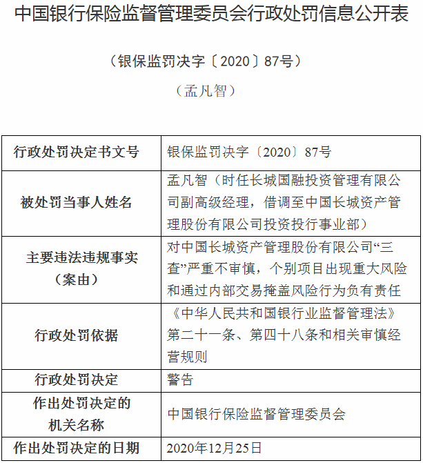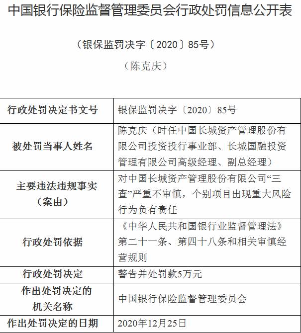 时任公司投资投行事业部、长城国融投资管理有限公司高级经理、副总经理陈克庆、时任长城国融投资管理有限公司业务审核委员会办公室和策略投资部副高级经理,兼任中国长城资产管理股份有限公司投资投行事业部职务,中国长城资产管理股份有限公司并购重组事业部副总经理宋颖、时任长城国融投资管理有限公司副高级经理孟凡智(借调至中国长城资产管理股份有限公司投资投行事业部)对公司上述“三查”严重不审慎,个别项目出现重大风险行为负有责任。