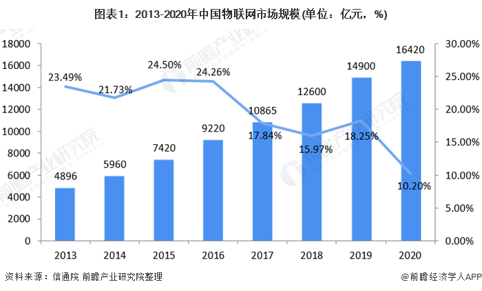 物联网芯片是物联网设备的核心部件,物联网芯片的发展无疑会带动整个物联网行业的发展。近年来中国物联网行业的发展受到监管部门的高度重视,各种与物联网相关的政策密集出台,对推动中国在物联网关键技术研发、应用示范推广、产业协调发展和政策环境建设等方面取得了显著成效。中国物联网行业规模保持高速增长,随着物联网信息处理和应用服务等产业的发展,中国物联网行业规模从2013年的4896亿元增长至2020年的1.6万亿元。