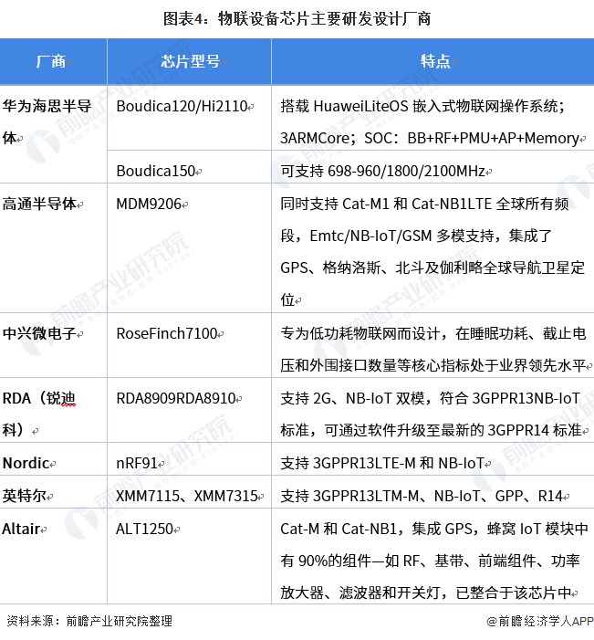 华为从2014年开始投入物联网芯片研发。2016年9月份,华为首次推出物联网商用芯片,同时也是业内第一款正式商用的物联网芯片。目前华为海思半导体的设计工艺和技术水平已逐渐追赶上国外先进企业,全球主要生产物联设备芯片产生包括华为海思、高通、中兴、RDA、英特尔等企业。
