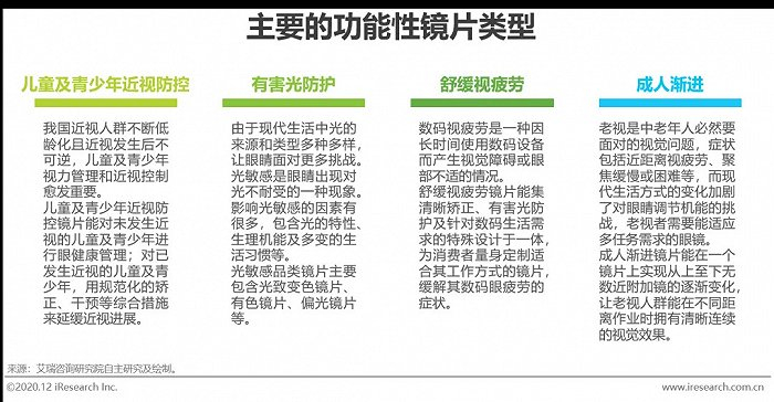 功能性镜片是指在日常普通镜片的基础上,通过调整镜片的基础材料、调节配方、光学设计或镜片膜层,使得镜片拥有一种或同时拥有多种功能特性,适用于更多人群,技术含量和产品价值更高的镜片。目前市场普及度较高、且未来仍有极大需求空间的功能性镜片类型主要包括儿童及青少年近视防控、有害光防护、舒缓视疲劳及成人渐进镜片等。