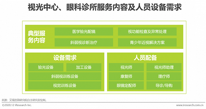 视光中心和眼科诊所能够为客户提供医学验光配镜、双眼视功能检查及异常处理、斜弱视诊断治疗、青少年近视发病原理及解决方案等服务,属于眼镜店和眼科医院或眼科门诊之间的一种新业态,是眼镜及镜片市场竞争优化的产物之一。