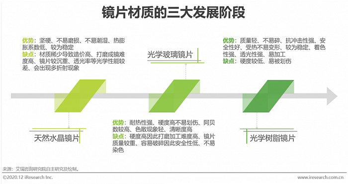 眼镜镜片从功能性上可以分为日常普通镜片和功能性镜片;从设计上可分为球面镜片、单非球面镜片、双非球面镜片以及自由曲面镜片等。从材质上,镜片经历了天然水晶镜片、光学玻璃镜片、光学树脂镜片三大发展阶段,其功能与形态也随之不断变化升级。其中树脂镜片由于具有质量轻、不易碎、安全性高、容易加工、较好的化学稳定性和透光性等优势,是目前最常用的镜片。