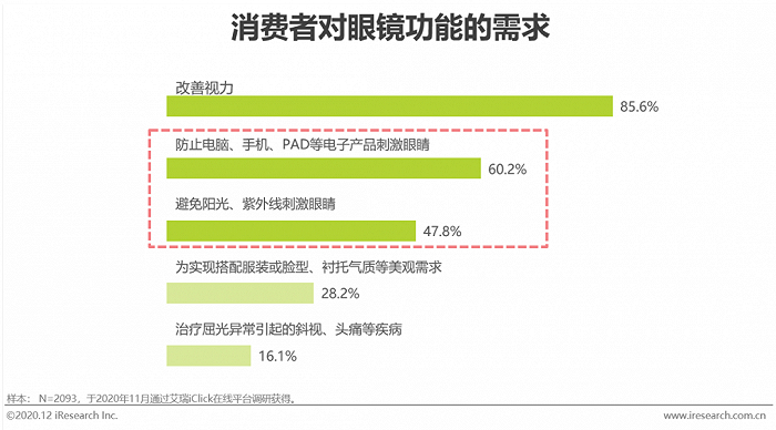 随着电子产品渗透率、使用频率和时长持续提升,消费者视光保护意识不断增强,防蓝光、缓解眼疲劳以及儿童眼镜等功能性眼镜产品同样适用于视力健康人群,带来更大的潜在受众规模。根据艾瑞开展的中国眼镜佩戴用户调研数据,当前消费者对眼镜的需求除了最基本的改善和矫正视力外,还在向防蓝光、缓解眼疲劳、光敏感等功能不断升级。在消费能力提升且眼镜需求越来越丰富和差异化的背景下,消费者更换眼镜的周期呈现逐渐缩短的趋势,平均更换或新购入眼镜及镜片的频率达到1.3年/次。