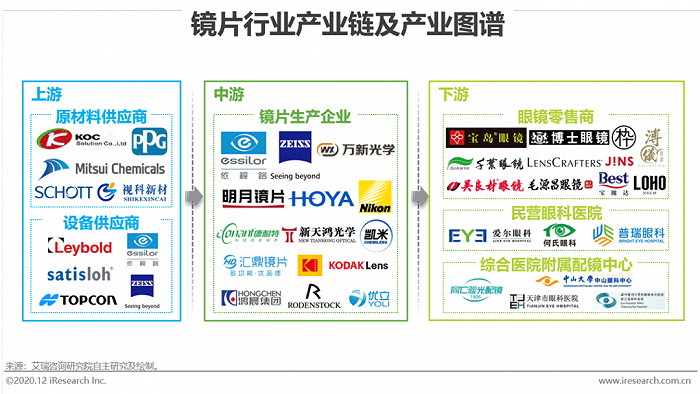 镜片行业产业链主要由上游的原材料和辅料供应商、设备供应商,中游的镜片生产厂商以及下游的代理商、经销商和镜片零售商组成,其中零售商包括连锁眼镜零售商、眼镜零售门店、电商平台、民营眼科医院以及综合医院附属的配镜中心等。上游厂商主要向中游生产商提供树脂、玻璃、塑料及模具、光学添加剂等镜片生产原料和生产设备,此外还向下游零售商提供验配设备;中游的镜片生产厂商除了加工生产镜片成品和定制的车房片,还要承担材料、膜层、工艺技术、光学性能等方面的研发设计工作,并为下游销售渠道提供销售折扣、专业设备、加工、售后、销售员及视光师专业培训等支持;下游零售商直接面对终端消费者,需要在门店配置专业设备和专业视光人员,为消费者提供验光、配镜、镜片镜架装配、试戴体验等专业服务。