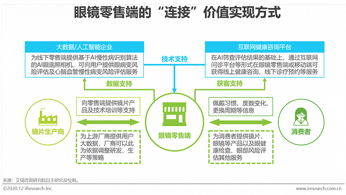 传统产业的数字化转型是近年来政府部门及社会各界最为关注的热点之一,“数字经济”已经成为中国经济增长的新引擎。眼镜及镜片行业同样身处于数字化浪潮之中,在数字化时代的大背景下,眼镜零售端的“连接”价值尤为关键。作为直接面对消费者的窗口,零售端积累了用户在验光及其他检查过程中留存的大量数据,具备建立用户眼部健康大数据平台的数据条件。在此基础上,零售端一方面能够向上连接生产端,以用户对镜片的核心需求、佩戴习惯、更换周期等数据为依据,指导上游厂商的研发、设计、生产、供货等行为;另一方面可以连接医疗、制药乃至大数据、人工智能企业,引入新技术、拓展新业务,使用户在零售端得到更优质、更全面的专业服务,推动眼镜零售端及整个眼镜产业的数字化转型。