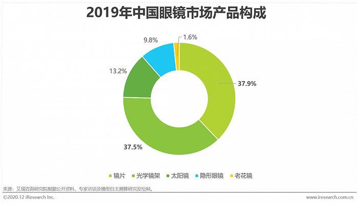 近年来,中国眼镜总体市场规模处于较为平稳的发展状态,2019年全国眼镜产品零售市场规模超过800亿元。2020年,受新冠疫情影响,眼镜产品市场规模将不可避免的出现下滑,预计市场规模将回落至733亿元。未来3年,眼镜市场有望实现较快复苏,预计到2023年突破900亿元。从产品构成来看,镜片与光学镜架是眼镜市场的核心产品,占总体规模的比重分别为37.9%与37.5%;太阳镜与隐形眼镜占比均在10%左右;老花镜占比较小,尚不足2%。