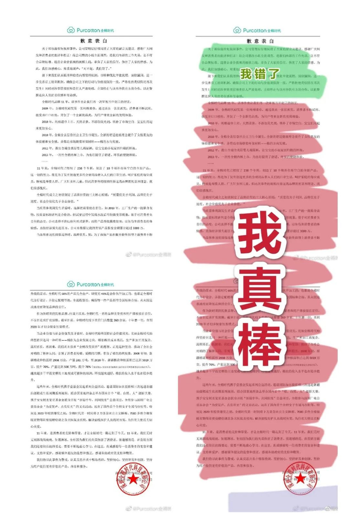 左为全棉时代官方致歉信,右为网友改图