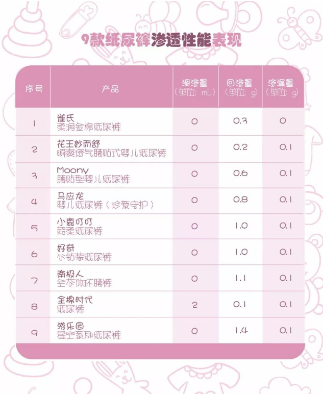 2019年10月,《消费者报道》针对小鹿叮叮、南极人、全棉时代、Moony、马应龙、好奇、雀氏、花王、游乐园等9款纸尿裤进行了测评。在渗透性能上,全棉时代是唯一一款出现滑渗的产品,其滑渗量为2mL。