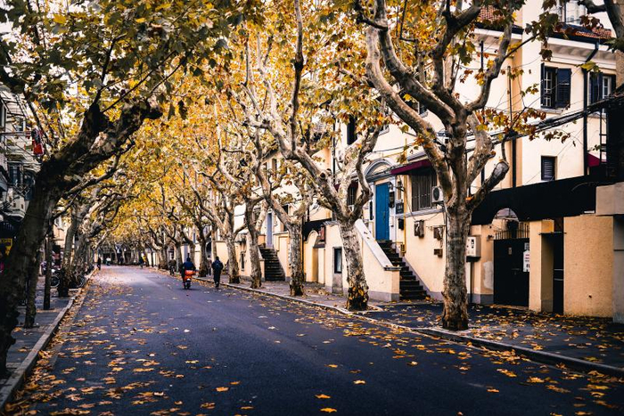上海有一条弯曲的小马路———延庆路,深秋时但见风吹黄叶,萧萧而下。那时的情景,用王小波的小说《三十而立》中的文字描述最为贴切:“落叶……像金色的潮水涌过路面。走着走着,觉得要头朝下坠入蓝天,两边纷纷的落叶好像天国金色的大门。”而延庆路所在的衡复风貌区,航拍视角下遍植梧桐,环绕房屋,以另一种姿态再现了。