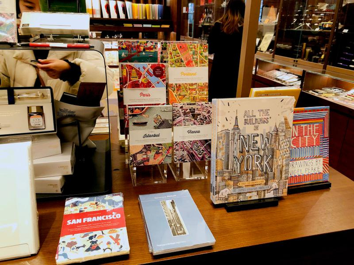 上海茑屋的旅行系列展示区,包括笔记本、摄影集、原版书和其他进口文创商品