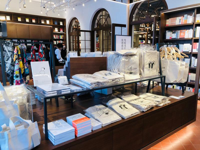 与天目里不同,茑屋上海首店的选址在拥有96年历史的哥伦比亚乡村俱乐部中,这也是茑屋书店目前最“古老”的门店选址。开业前三天,书店提前放出了每2小时500人的预约名额,因此茑屋上海店内的客流始终比较平稳,“提袋率”也较为可观,不少读者都选择带一、两本书或一件开业限定的周边商品回家,虽然一只附拉链的帆布袋售价可达600元。