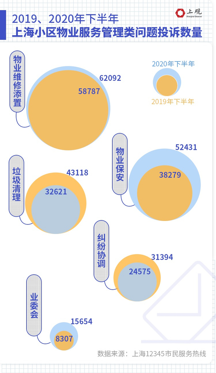 考虑到去年上半年疫情期间的投诉并不具有典型性,据“12345”统计,仅去年下半年,上海市民就拨打了190373次热线,就小区“物业服务管理”的主要问题进行投诉。而相比前年同期的179885件投诉,投诉量有了明显的增长。