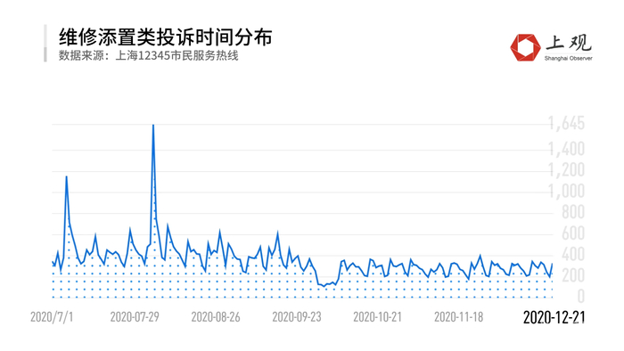 记者对62092件物业“维修添置”类投诉的内容进行了词频分析。分析结果显示,“漏水”以出现42423件高居榜首,“渗水”也出现了10052件,“积水”则从时间分布来看,7月至9月是“维修添置”类投诉的高发季节,这符合申城雨季特点。如去年7月6日和8月5日,申城大暴雨,单日“维修添置”类投诉量均出现了“极点”,分别高达1156件和1645件。