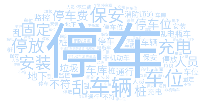 词频分析显示,“停车”是市民投诉的最热词,共出现24776次。连带着“车辆”、“车位”、“停车位”、“停放”、“停车费”等都成为了热词。可以看出,对于小区停车管理的不满,是“物业安保”类投诉中的主要内容。