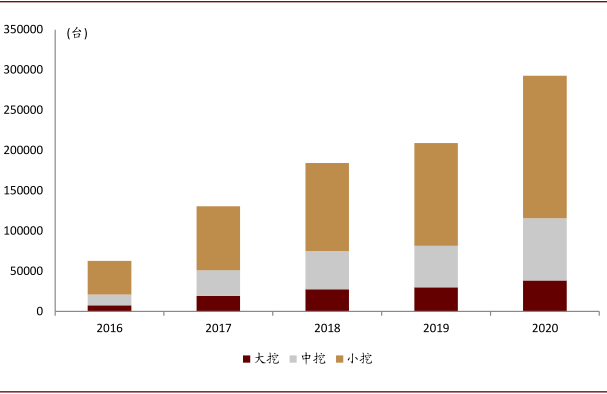 国内销量分吨位看,2020年大挖(≥28.5t)/中挖(18.5~28.5t)/小挖(<18.5t)销量分别为3.8/7.7/17.7万台,同比增速28%/50%/39%。自7月份以来,中挖显著跑赢其他吨位产品,11-12月连续翻翻增长。中挖在2020年相对保持较高增速,主要受益于房地产和基建投资拉动,以及对装载机的替代效应。远期来看,小挖(含微挖)受益机器换人、农机替代等结构性因素,我们预计保有量有较大提升空间。