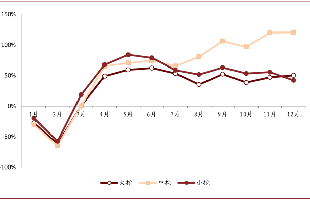 图表: 2020年1-12月国内挖机分吨位销量增速