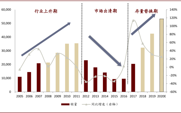 资料来源:中国工程机械工业协会,中金公司研究部。注:2013-2017年正向坐标轴扣除阴影部分为行业实际销量,2018-2021年正向坐标轴为行业实际销量或预测销量。
