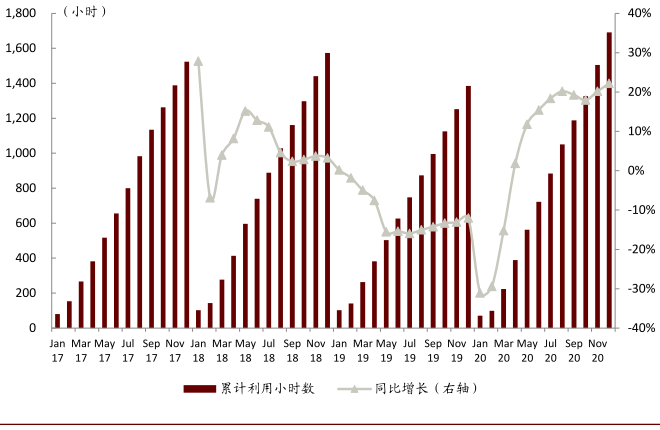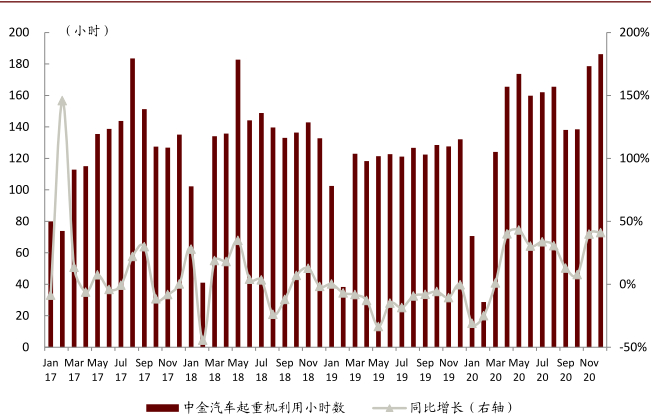 12月中金汽车起重机利用小时环比增速,大吨位供应紧俏。12月份中金汽车起重机利用小时数为186.3 小时,同比增长41.0%,环比再度提速。风电强装下,大吨位供不应求,三一、中联等反馈大吨位订单排产至2021H2。我们预计2021年行业增速15%~20%。