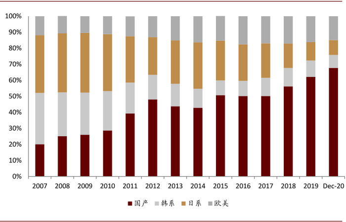 本轮周期下,国产龙头企业主要凭借技术服务优势、供应链优势、市场响应能力获取市场份额,外资竞争优势削弱。2020年,国产/韩系/日系/欧美份额分别为69%/7%/9%/15%,内外资呈现7:3比例。我们认为本轮龙头崛起是全产业链共赢结果,包括液压件等核心零部件国产化趋势确立,主机厂高端化、国际化、数字化转型等综合因素。