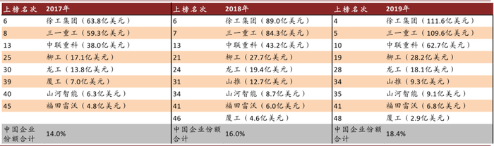 图表:2017-2019年全球工程机械前五十强