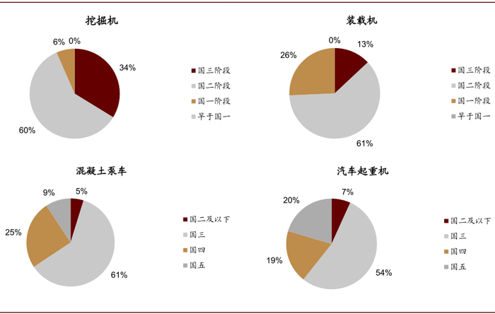 我国低排放标准的道路机械保有量占比超过60%。当前国内存量混凝土泵车、汽车起重机以上一轮行业高峰时销售的国三设备为主。我们测算国内混凝土泵车、汽车起重机的保有量中属于国三标准及以下的存量设备占比分别高达65.7%/61.0%。