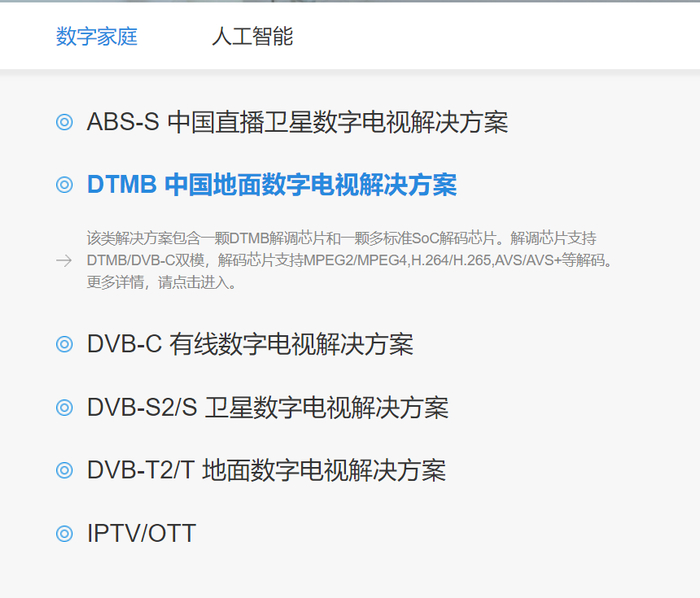 另外,除IPTV/OTT机顶盒解决方案外,杭州国芯数字电视领域的解决方案还包括:ABS-S 中国直播卫星数字电视解决方案、DTMB 中国地面数字电视解决方案、DVB-C 有线数字电视解决方案等。值得注意的是,海思半导体与晶晨股份也有DVB芯片及解决方案的研发投入。