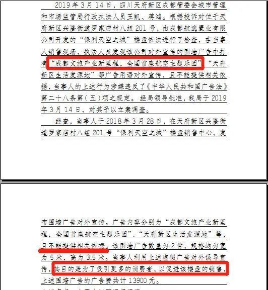 2017年12月,保利天空之城项目一度被成都天府新区管委会因涉嫌“违反广告法”进行立案调查。