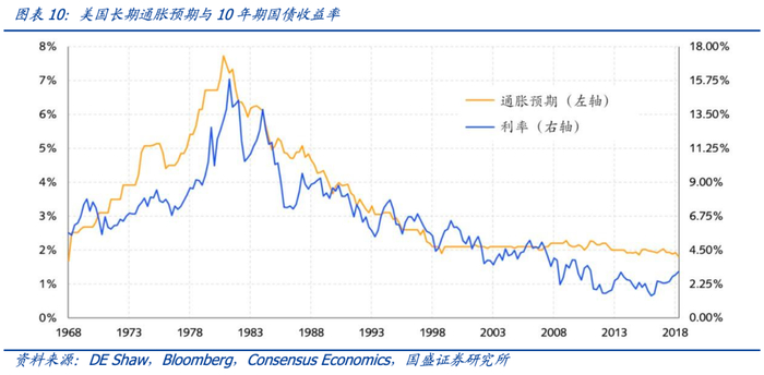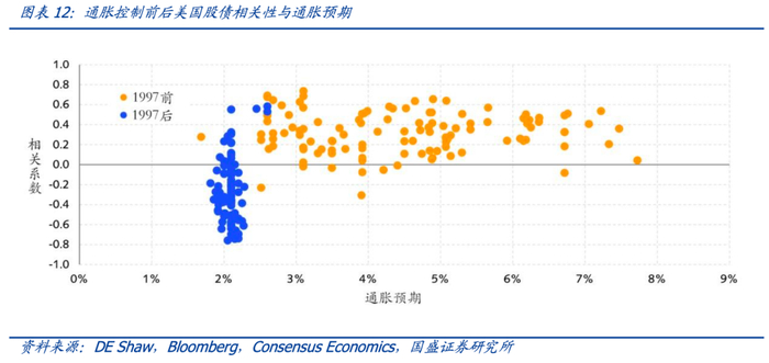 当时的这种股债相关性长期转负的现象来源于美联储以及其他发达国家央行对通胀的控制和锚定。上世纪70年代由于石油危机等因素的影响,美国进入了高预期通胀的阶段,根据我们第一节提出的框架,高预期通胀本质会同时影响股债定价的折现率,也就会使得股债呈现正相关性。1979年Paula Volcker出任美联储主席,改“价格调控”为“总量调控”,通过控制货币总量降低总需求,在1997年终于完全的抑制住了通货膨胀。