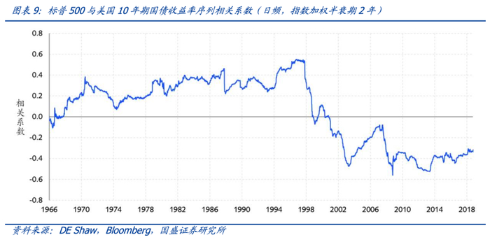 美国市场的股债相关性历史上发生过明显的机制转换(Regime switch)。60年代至90年代前期股债相关性基本为正,1997年后期股债相关性急转直下,2000年之后股债相关性基本维持在负数。