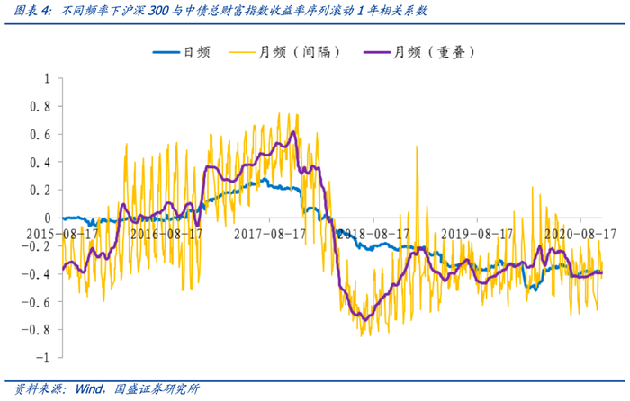 资产收益率序列的Pearson相关系数在不同计算频率下有所区别。我们按照滚动1年的区间长度,采用日频、月频(间隔)、月频(重叠,Overlapping)三种方式计算沪深300与中债总财富指数收益率序列的相关系数,可以看到三者趋势相近但细节上差异较大,特别是日频和月频的相关系数(月频下采用间隔法计算的相关系数基本仍然围绕采用重叠法计算的相关系数波动)。导致此差异的主要原因在于时间序列的自相关性和交叉滞后相关性。