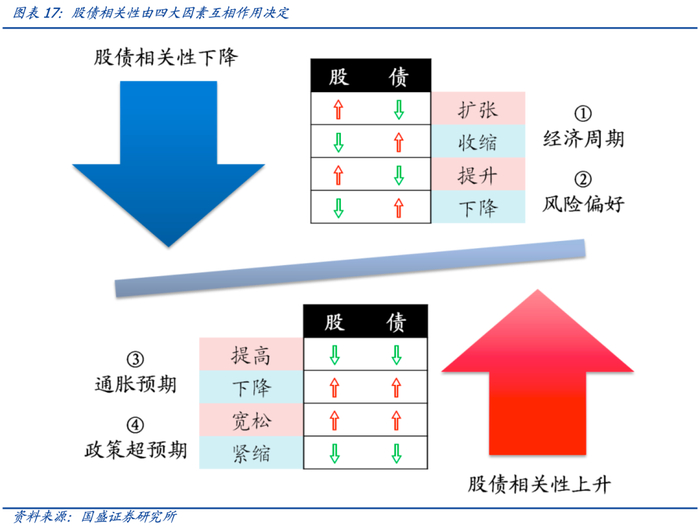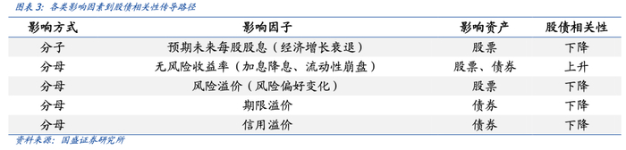 因而股债相关性的所有分析都可以基于这些因素。当某一因素仅影响了其中一个资产时,股债相关性将下降,当某一因素同时影响了两个资产时,股债相关性将上升。我们在下表中简单举例阐述影响路径和导致的股债相关性结果,当然实际情况一般是多个因素同时作用的综合结果: