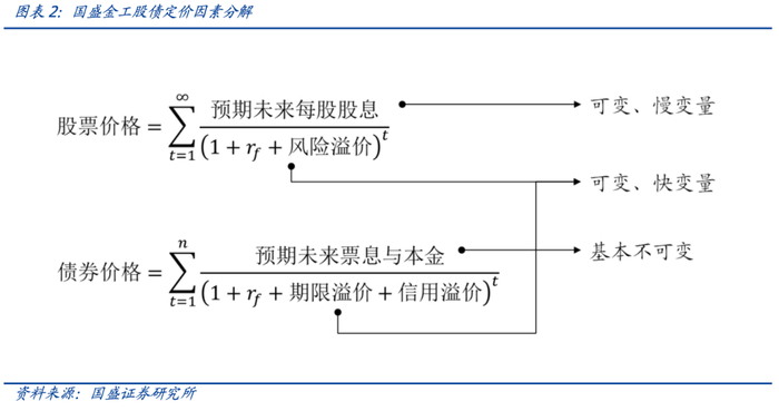 我们对股债DDM模型进行进一步剖析。分子部分股债定价模型的区别在于:股票的分子是可变的,且为慢变量,债券的分子是基本不变的。分母部分股债定价模型的区别在于:股票的折现率为无风险收益率+风险溢价,债券的折现率为无风险收益率+期限溢价+信用溢价。股票和债券定价公式的分母部分都是快变量。
