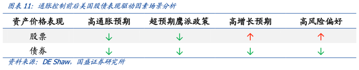 通胀控制的成功使得资产价格波动愈发依赖于市场对经济强弱变化的预期以及市场风险偏好的变化,而非高通胀预期以及通胀控制政策带来的对于分母端的直接影响,从而使得股债相关性变负。我们将此过程展示在下表中:在通胀控制之前前两类因素占主导,但是在通胀控制政策成功实施后,前两个因素的影响减小,仅剩增长预期与风险偏好,因而股债负相关性开始占主导。