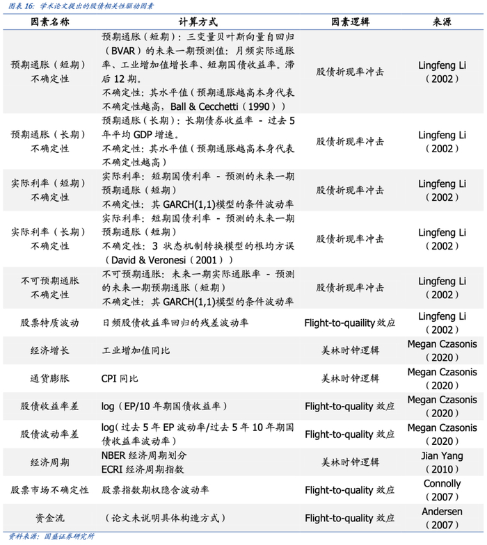 除此之外Lingfeng Li的模型中股债定价都受到不可预期通胀的影响,因而不可预期通胀不确定性与股债相关性也有直接联系。本报告将Lingfeng Li以及其他关于股债相关性的重要论文中总结的影响因素整理如下: