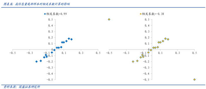 可以看到单期相关性对总体相关性的贡献取决于单期样本所携带的信息量。也就是说,偏离均值越远的样本对相关性的贡献越高。尾部样本更大的决定了相关系数,而中心样本(均值附近的样本)对相关性影响更小。一个尾部样本可能需要许多个同向中心样本才能提供等价的贡献,因而Pearson相关系数对厚尾分布更为敏感,在防范投资风险当中具有显著意义,因为决定投资收益的并不是信息量较小的样本,而往往是那一两个尾部样本。