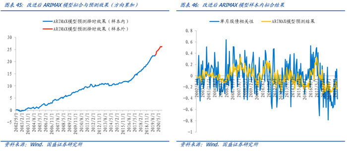 根据以上筛选到的宏观因子,我们首先采用ARIMAX模型构建基本的回归预测模型。之所以采用ARIMAX模型主要原因在于股债相关性序列本身具有“自相关性”。具体的我们采用(p,d,q)=(1,0,6)的ARIMAX回归。样本内数据为2002.03-2019.12,样本外数据为2020.01-2020.10。回归得到的模型样本内择时胜率为66.98%,显著大于每个单因子的择时胜率。模型样本外胜率100%。可以看到模型从2016年起胜率显著上升。