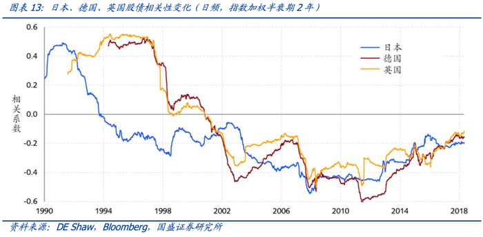 90年代股债相关性的机制转换不仅仅发生在美国,实际在其他发达国家包括日本、德国、法国、英国、加拿大、意大利等都发生了类似的变化。主要驱动因素与美国相同,都来自通货膨胀预期的明显下降。