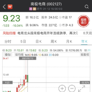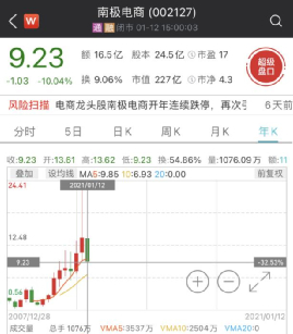 因被质疑财务造假,开年来,300亿电商巨头股价已遭遇多个跌停,累计跌幅超32%。截至1月12日收盘,南极电商股价再度跌停,报收9.23元/股。