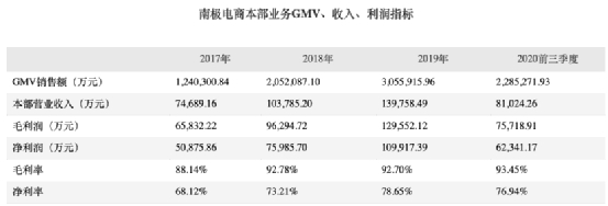 2019年南极电商本部业务(品牌综合服务业务占比85%以上)毛利率达92.70%,堪比贵州茅台。2020年前三季度,公司实现营业收入27.72亿元,同比增长4.73%,净利润为7.22亿元,同比增长19.90%。