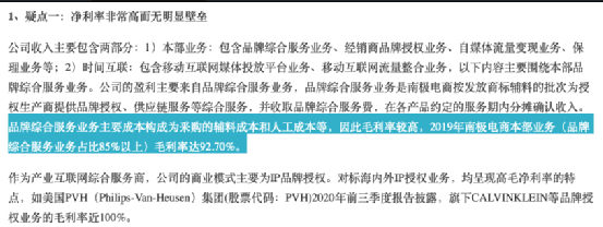 针对“净利率非常高而无明显壁垒”的质疑,公司澄清:品牌综合服务业务主要成本构成为采购的辅料成本和人工成本等,因此毛利率较高,2019年南极电商本部业务(品牌综合服务业务占比85%以上)毛利率达92.70%。