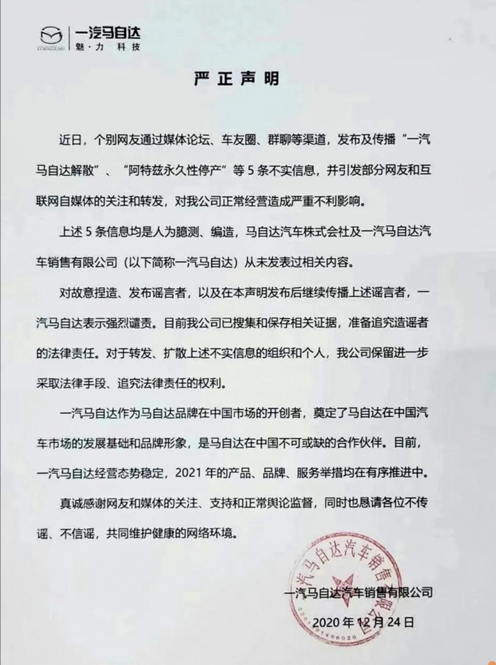 2020年岁末,一则关于一汽马自达将解散的消息喧嚣一时。消息称,由于一汽与马自达的合约即将到期,无意再续,且马自达单薄的产品线无力支撑在华两家合作企业,因此一汽马自达将解散,其员工将转至一汽旗下奔腾或红旗事业部。很快,一汽马自达针对包括“一汽马自达解散”的消息发布严正声明,称网传消息为不实消息。