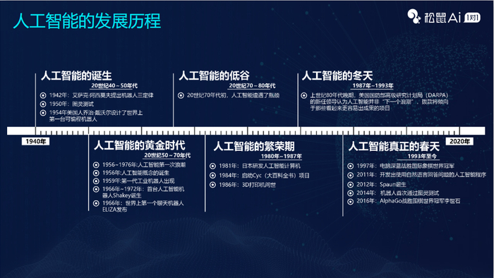 在人类历史长河中,工业革命是一个给生活是带来突飞猛进的变革。相比工业革命有300多年历史,人工智能在历史潮流中的时间并不长,只有60多年的历史。1956年在美国的达特茅斯会议上首次确认了“人工智能”这个术语和领域,从那时开始,就进入了人工智能的时代。但从60多年的历史潮流来看,人工智能的发展并不是一帆风顺的,它经历了潮起潮落。