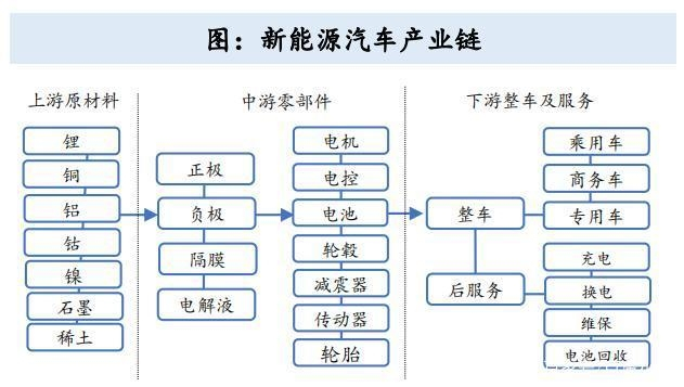 新能源汽车产业链主要包括上游锂电池及电机原材料、中游电机,电控,电池等零部件以及下游整车,充电桩和运营三个环节。
