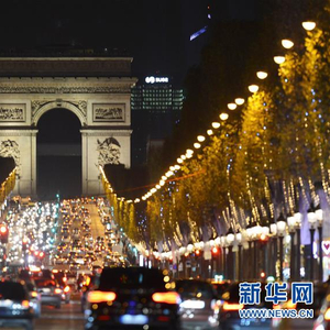 2016年11月21日,法国巴黎香榭丽舍大街被道路两旁行道树上的灯饰装点得流光溢彩。(图片来源:新华社)