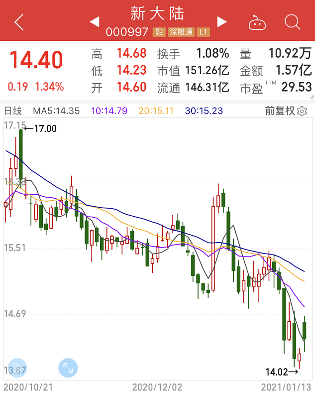据悉,国通星驿正是第三方支付领域A股上市公司——新大陆数字技术股份有限公司(下称“新大陆”)旗下全资子公司。不过,今日新大陆股价并未受太大波及,截至收盘,股价报收14.4元,收涨1.34%。