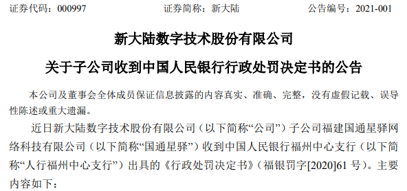 新大陆表示,“公司及国通星驿将吸取经验教训,积极拥抱监管,进一步促进各项业务健康发展。本次行政处罚金额将计入公司2020年当期损益,不会对公司及国通星驿后续主营业务及经营业绩造成重大影响。”