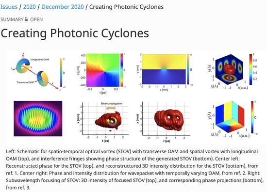 然而,在庄松林院士的指导下,上理工詹其文教授带领的纳米光子学团队历时2年,创造性地将这两个领域 “合二为一”,首次从理论到实验展示了具有时空涡旋相位并携带光子横向轨道角动量的新型光场,开创了一个全新的光子轨道角动量自由度。相关研究成果发表在世界光学顶尖期刊《自然-光子学》上,并成功入选美国光学学会(OSA)评选的2020年度全球30项光学重大进展。据了解,国内仅有4家单位入选,且上理工为独立完成单位。